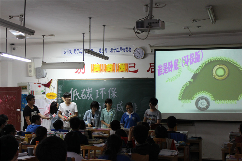 班会首先以观看破坏生态、破坏环境的图片与主持人的解说开始,点明班会“环保”的主题。第二阶段以环保知识的普及为主,有环保知识竞赛,环保知识问答,涉及地理、政治、经济、化学、生物等各个领域,直指污染、浪费两大促使环境恶化的元凶;面对这种种环境问题,经全体学生共同探讨最后明确了解决方法;最终在《谁是卧底·环保版》游戏环节中以轻松愉悦的气氛完美的结束了本阶段。班会最后,班主任唐夏玫老师作总结讲话,告诉大家珍惜我们目前拥有的美好环境,珍惜大家为了环保所做的努力,共同爱护我们的地球。
