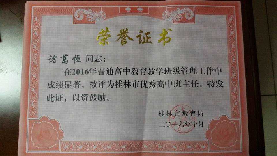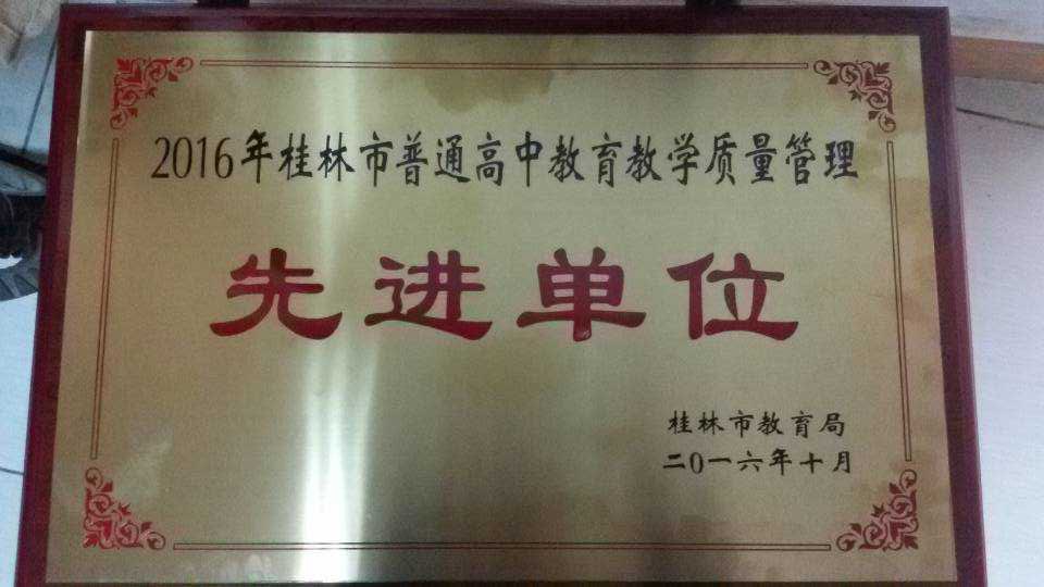 2016年10月28日上午,桂林市2016年高考总结表彰大会在龙胜中学隆重举行。会上表彰了一批桂林市2016年普通高中教学管理先进单位和先进个人。我校凭借优异的教育教学管理成绩被评为“2016年桂林市普通高中教育教学质量管理先进单位”,刘新来同志被评为“2016年桂林市普通高中教育教学质量管理先进个人”,诸葛恒、梁新秀同志被评为“2016年桂林市普通高中教育教学质量管理优秀高中班主任”。