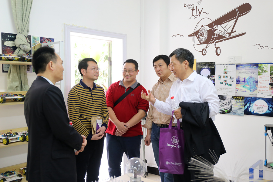 接下来清华大学两位教授到我校科技创新实验室进行了参观指导。两位教授了解到我校正在开展智能小车和单片机的学习,表示这样的课程非常好,对于学生学习编程、电子设计以及结构设计都有非常大的帮助。