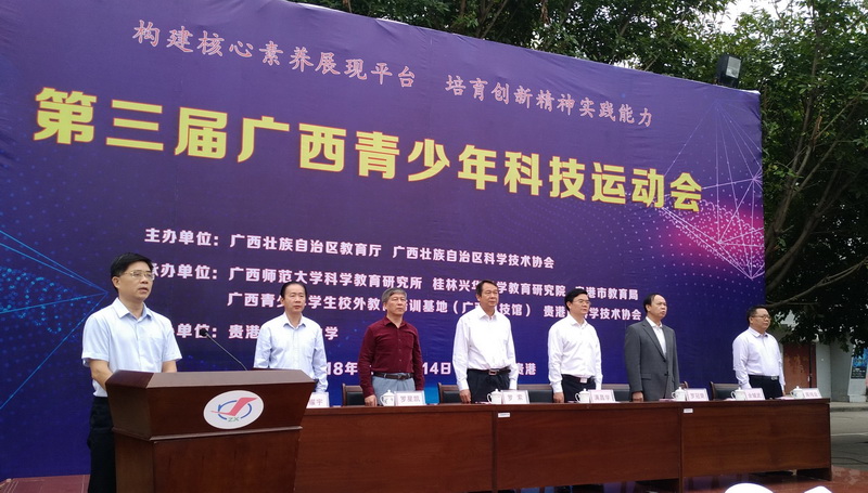 2018年10月13-14日,由自治区教育厅、自治区科协主办,广西师范大学科学教育研究所、桂林兴华科学教育研究院、贵港市教育局、广西青少年学生校外教育培训基地(广西科技馆)和贵港市科协承办,贵港市江南中学协办的第三届广西青少年科技运动会,在贵港市江南中学举行。来自全区14个市183所学校的1253名选手参加本届运动会,其中1130人组成595队分别参加“水火箭比高”、“铁丝陀螺比久”、“抛石机攻城”、“纸桥承重”、“气弓箭打靶”、“螺旋桨反冲力小车竞速”、“落体缓降比慢”等7个竞技项目的比赛,123人提交50项研究性学习成果参加展评项目的角逐。13日上午,自治区高校工委副书记满昌学、贵港市人大常委会副主任罗冠荣、自治区教育厅基教处处长罗索等领导出席开幕式。