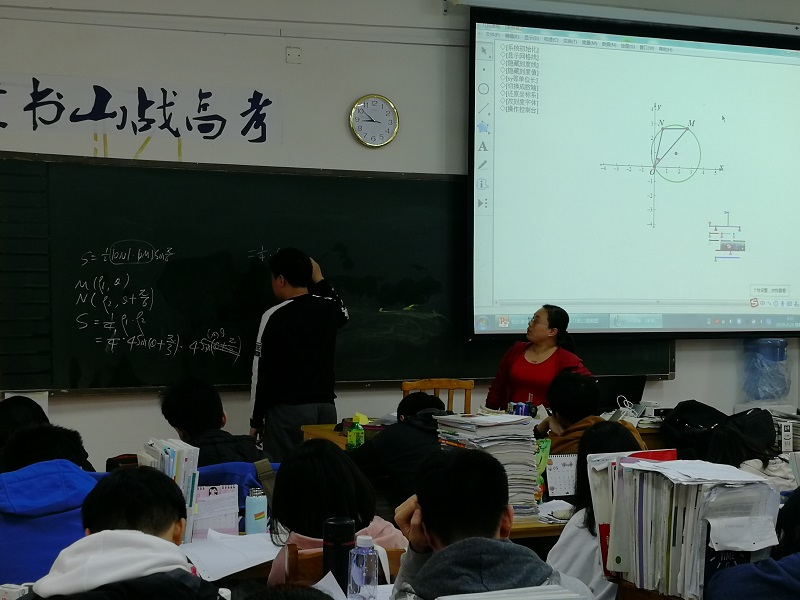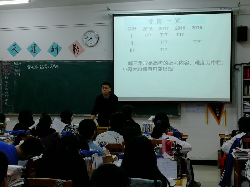 随着高考倒计时数字的不断跳动,附中的各项备考工作也在紧锣密鼓的进行,3月28日周四,高三数学拟进入第二轮复习。在这个背景下,本着以思维型课堂,促复习,备高考的目的,我校数学组高三的侯宇皆,唐夏玫,陈华三位老师,分别在329,331,328给我们带来三堂数学研究课:侯宇皆的《解三角形及其工具运用》,唐夏玫的《极坐标与参数方程应答策略》,陈华的《平面几何的几个小问题思考》。这些课,引来了不少老师的参观和学习,促进了教师团队在教学方面的互相交流与互相提高,同时也进一步激发了高三学生学习的积极性。课后,组内老师围绕着这几堂课进行的深入密切的交流。相信,在附中师生的共同努力下,2019高考,结果会对得起我们的努力付出,会有一个让我们满意的成绩。