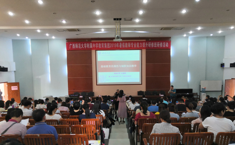 2019年8月28日,由广西师范大学附属中学教育集团主办,广西师范大学教育学部提供专业支撑的“广西师范大学附属中学教育集团2019年暑假教师专业能力提升研修班”在广西师大附中阶梯教室,会议主题“”广西师大附中、桂林市宝贤中学、广西师大附中双语实验学校和博阳小学各教职工共250多人参加此次培训,分有高中分会场、初中分会场和小学分会场,通过现场讲座和远程录播等形式进行学习。