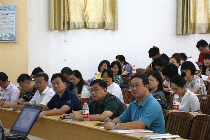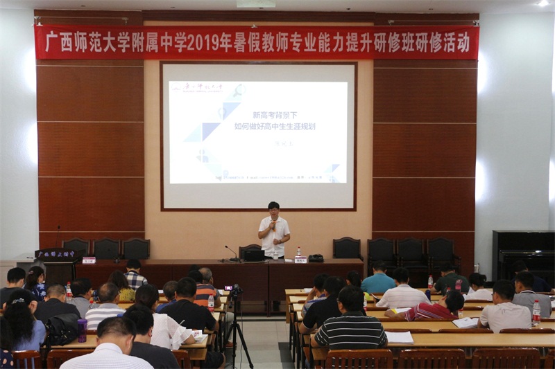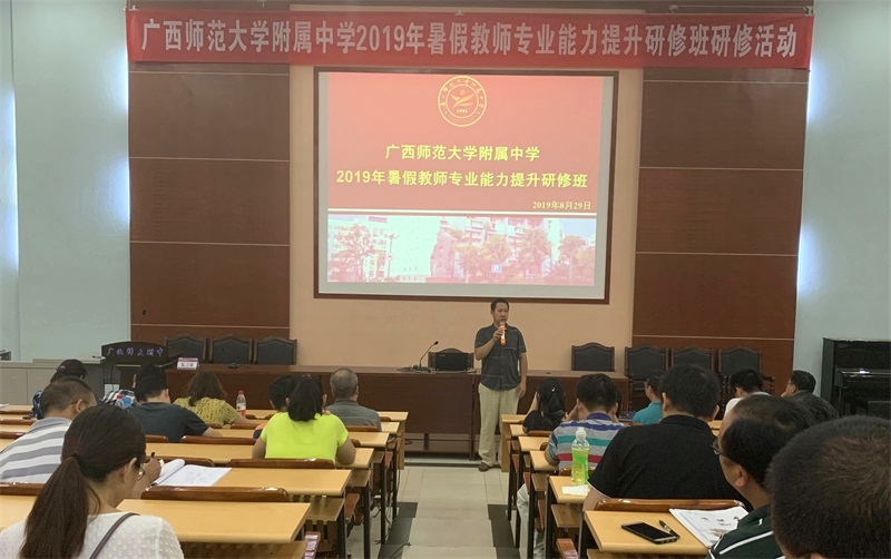 2019年8月29日,广西师范大学附属中学教育集团2019年暑假教师专业能力提升研修培训分高中组、初中组、小学组三个学段进行,高中部全体教师在阶梯教室参加了培训。